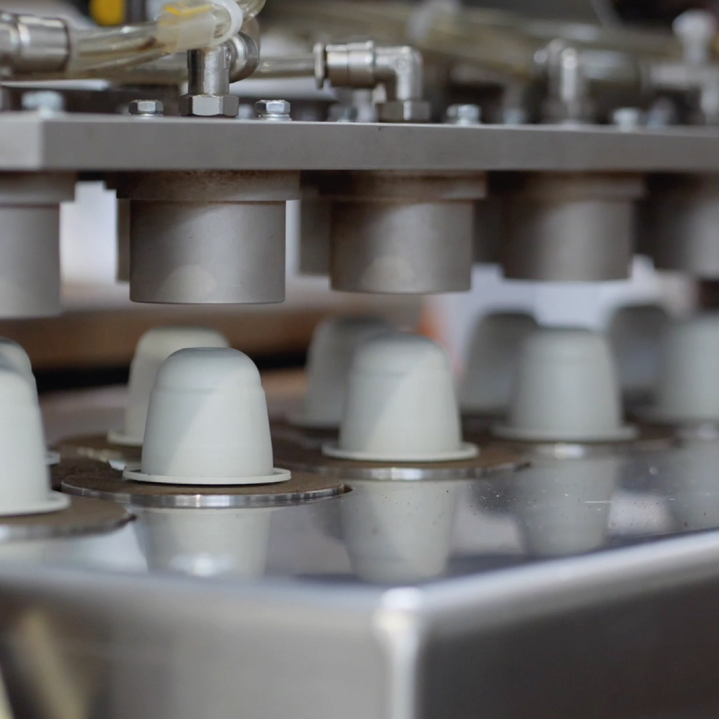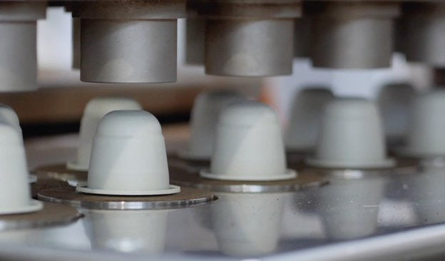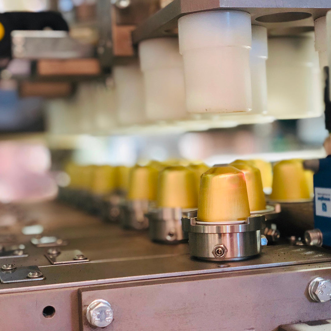 Die Kapseln werden von einem Praktiker entnommen, der sie aufgereiht hat, von einem mechanischen Arm, der jeweils vier auf einer Gabel hat und mit einer dreifach gelaserten Folie beschichtet. Die beschichtete Kapsel läuft unter einer Fotozelle hindurch, die das Produkt, das nicht mit der Folie beschichtet ist, verwirft. Die Kapsel wird dann mit einem mechanischen Spender entsprechend der Rezeptur mit dem Produkt befüllt und schließlich mit einem Deckel verschlossen, der das Produkt vollständig versiegelt. Während der Produktion wird ständig das Gewicht des in jede Kapsel eingefüllten Produkts überprüft, und zwar sowohl von den Verantwortlichen für die Qualitätskontrolle als auch vom Produktionsleiter, ebenso wie die Schweißung, der Sauerstoffgehalt in der Kapsel, die korrekte Abgabe des Produkts durch die verschiedenen auf dem Markt befindlichen Nespresso®*³ - und Dolce Gusto®*³ -Maschinen, die Messung des Brix-Wertes des ausgegebenen Kaffees und der Geschmack des Produkts, um seine Güte und die Übereinstimmung mit dem Rezept zu bewerten.