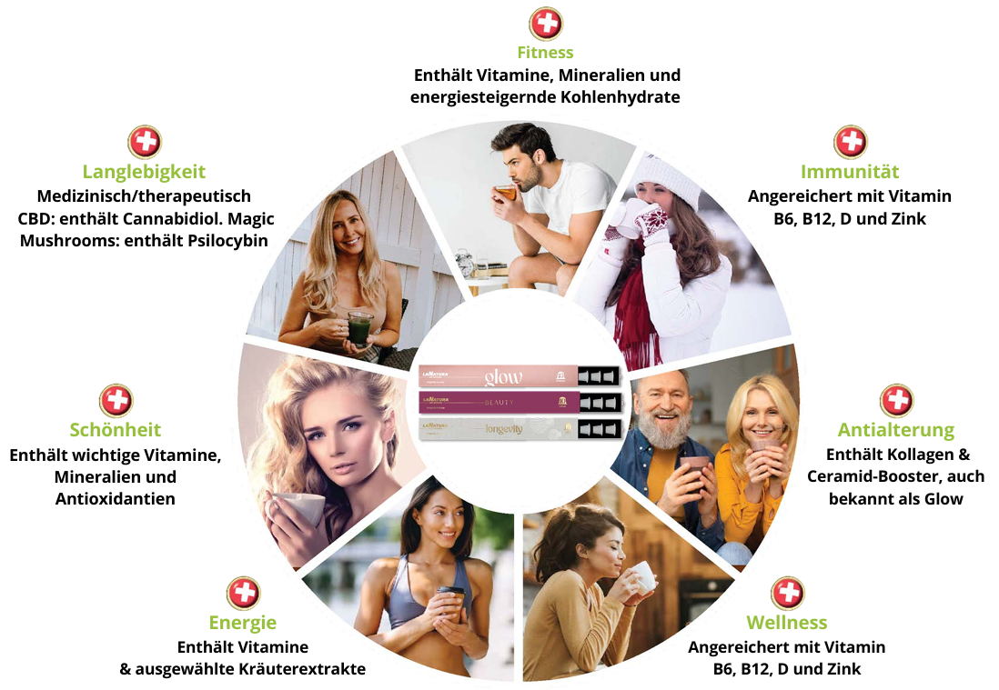 #1 Die Kaffee-und Teeinnovationen von La Natura Lifestyle International Holding AG erfüllen Ihre funktionalen Bedürfnisse rund um die Uhr. Wir bieten Lösungen für jede Gelegenheit und jede Bedürfnislage während des Tages.